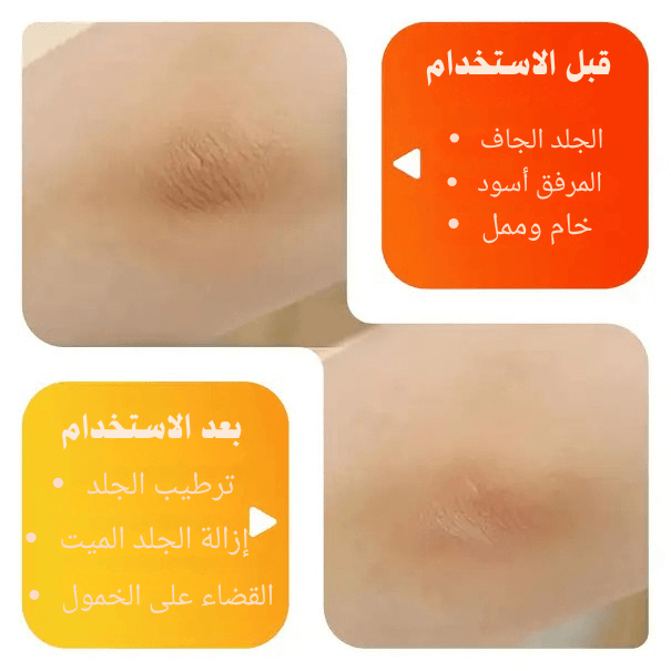 جلدي كان خشن وداكن خصوصاً في الكوعين، بعد استخدام المنتج صار ناعم ولونه متوحد، وصرت ما أستغني عنه قبل أي مناسبة.